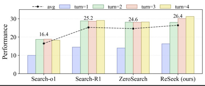 相比之下,ReSeek 的性能从一轮到四轮单调递增,展现了更强的自我纠错能力:当交互轮数更充裕时,它会在不确定时重新查询证据、优化规划并修正答案。平均性能也印证了这一趋势,ReSeek 取得了最高的平均分,证明该方法能将更多的交互预算转化为真实的性能增益,而非冗余操作。