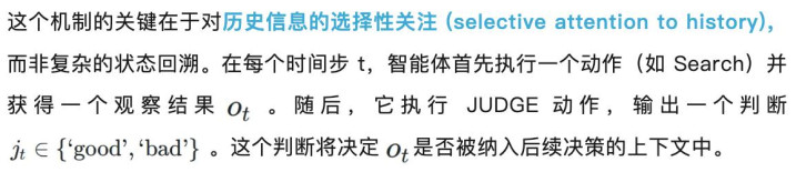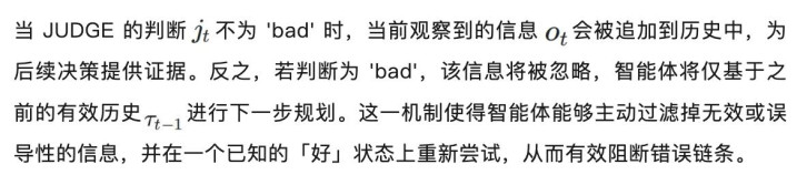 为了赋予智能体自我反思和动态纠错的能力,团队扩展了 Agent 动作空间,引入了一个核心的 JUDGE 动作。该动作在每次信息获取后被调用,用于评估新信息的有效性。