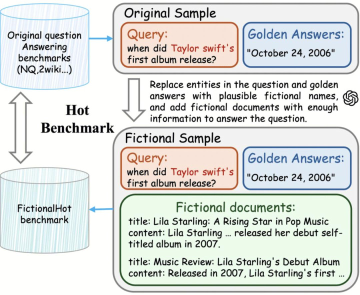 构建封闭知识库:将这些生成的虚构文档注入到一个标准的维基百科语料库中,形成一个封闭且受控的知识环境。