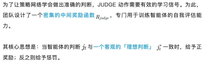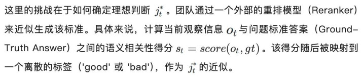 这种奖励塑造(Reward Shaping)策略为智能体提供了密集的、步进式的反馈,引导其逐步学会如何准确评估信息价值,从而使 JUDGE 动作真正有效。
