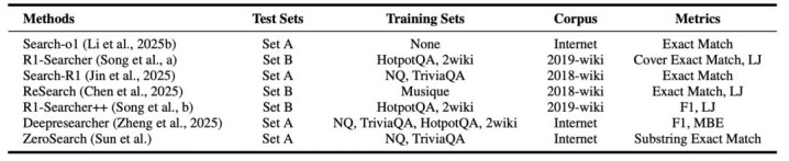 测试集 (Test Sets): 有的研究使用涵盖多种任务的广泛测试集(如 NQ, TriviaQA 等,集合 A),有的则专注于需要复杂推理的多跳问答任务(如 HotpotQA, Musique 等,集合 B)。