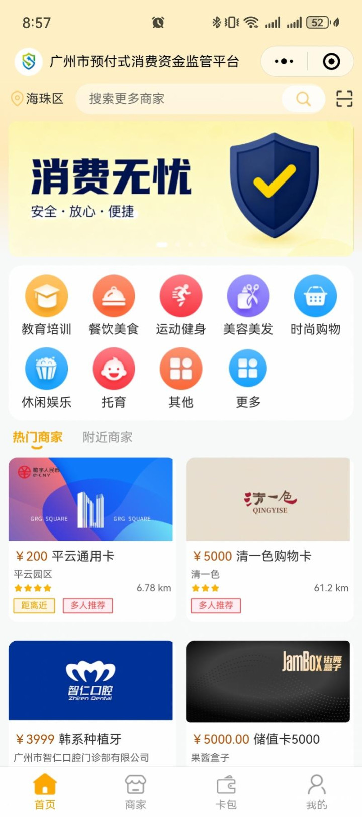 南都记者在“广信预”小程序上看到,平台上列出了教育培训、餐饮美食、运动健身等多个栏目。通过实名认证登录,消费者可在平台上选购入驻商家的年卡、多次卡等预付产品。预付资金显示在消费者的“监管资金”账户中,消费记录一目了然。据了解,该平台已入驻商家209户,涉及市民日常消费方方面面。