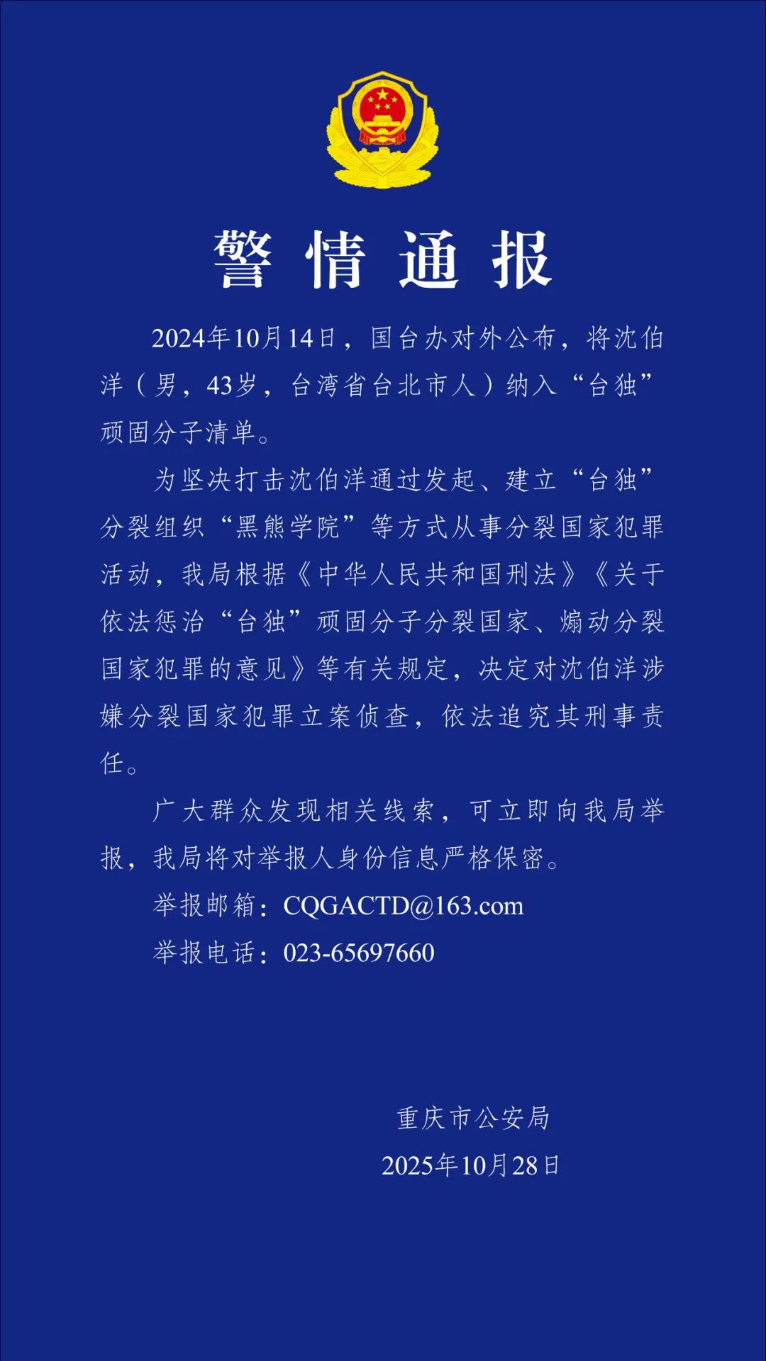 重庆市公安局10月28日发布警情通报表示,为坚决打击沈伯洋通过发起、建立“台独”分裂组织“黑熊学院”等方式从事分裂国家犯罪活动,该局根据《中华人民共和国刑法》《关于依法惩治“台独”顽固分子分裂国家、煽动分裂国家犯罪的意见》等有关规定,决定对沈伯洋涉嫌分裂国家犯罪立案侦查,依法追究其刑事责任。