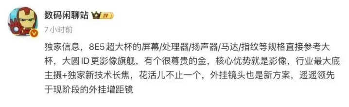 该博主此前曾爆料,某厂骁龙 8E5(第五代骁龙 8 至尊版处理器)超大杯机型的屏幕、处理器、扬声器、马达、指纹等规格直接参考大杯,沿用大圆 ID 设计。